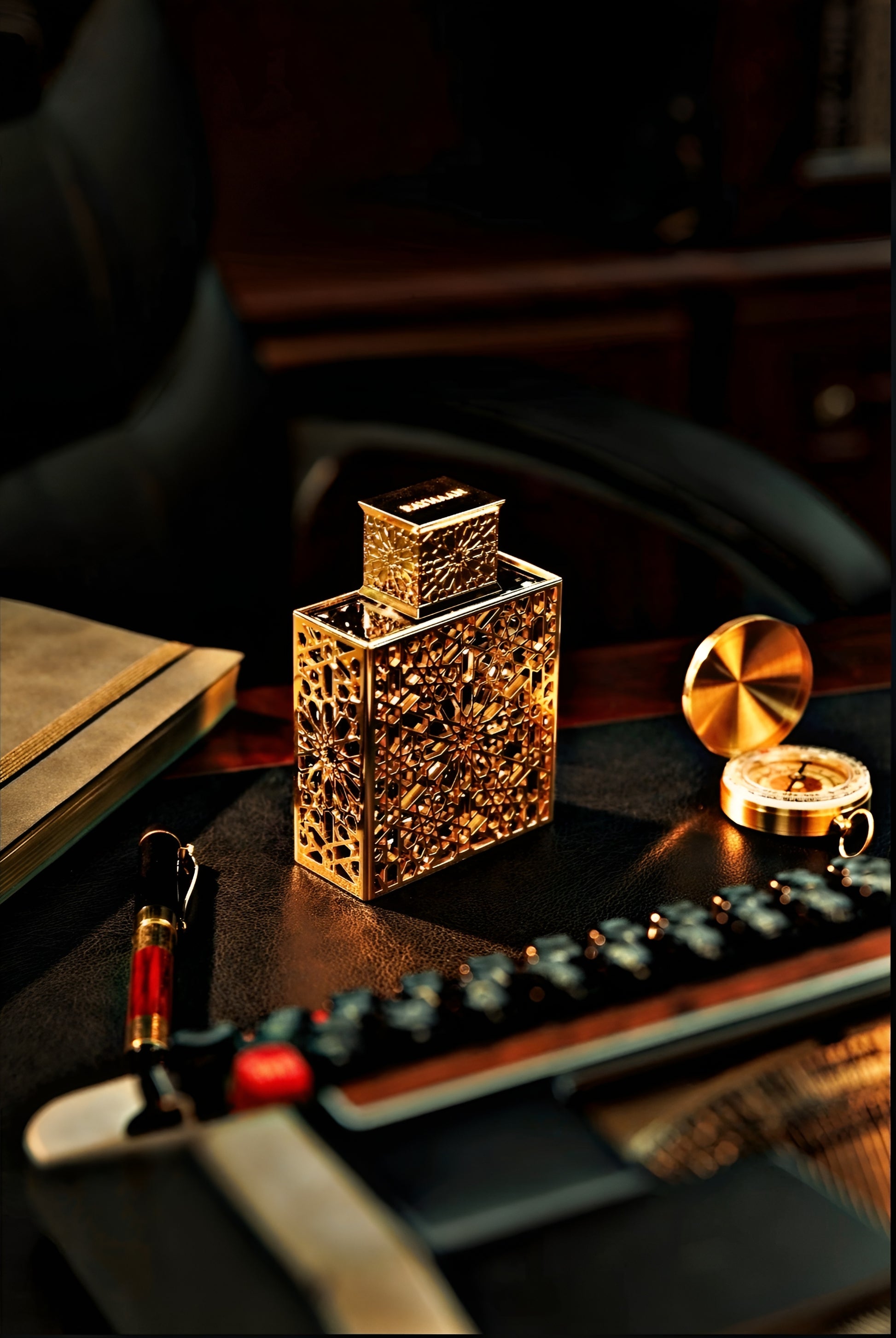 Clad in regal gold, the bottle stands as a symbol of prestige, divinity, and unshakable power — the mark of a fragrance that does not follow… it leads.